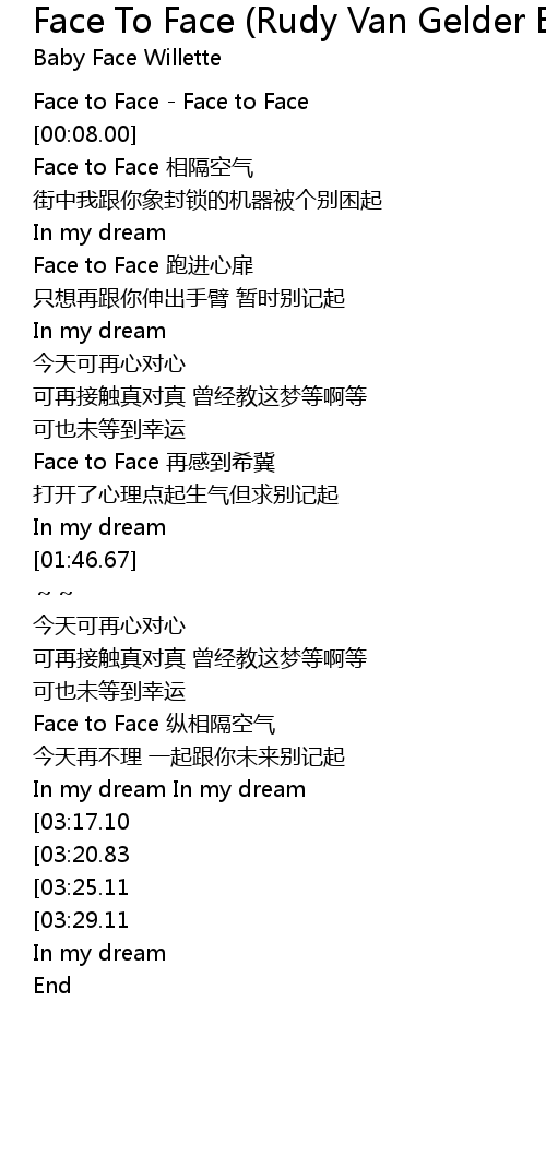| [03:33.75][03:17.10][02:59.69] | Face to Face 再跑进心扉 |