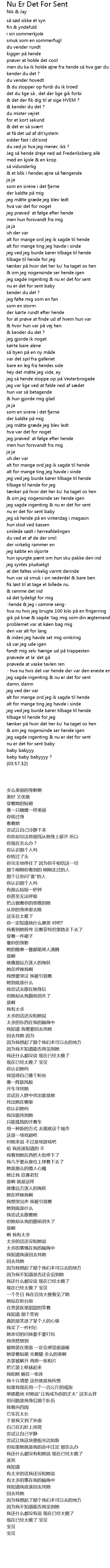 | [00:18.92] | men du ka ik holde øjne fra hende så hva gør du nu ? |