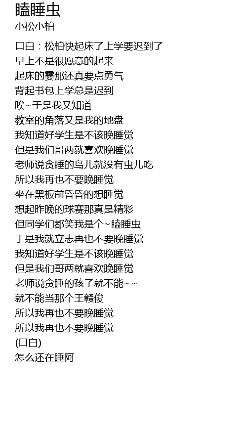 | kǒu bái: sōng bǎi kuài qǐ chuáng le shàng xué yào chí dào le | |