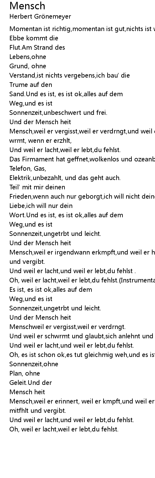 Oh, weil er lacht,weil er lebt,du fehlst.(Instrumental) |