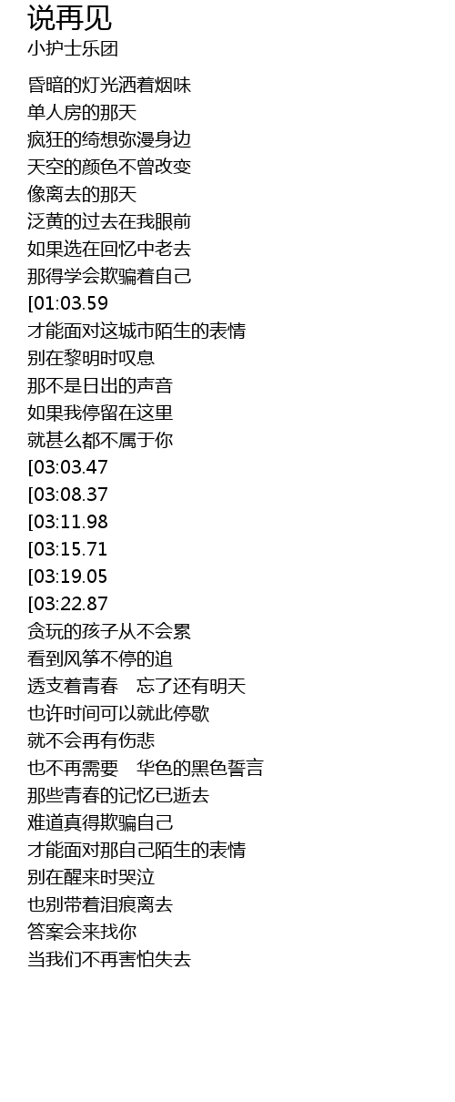 | [04:28.04][03:03.47][01:24.79] | wo bu xiang shuo zai jian |