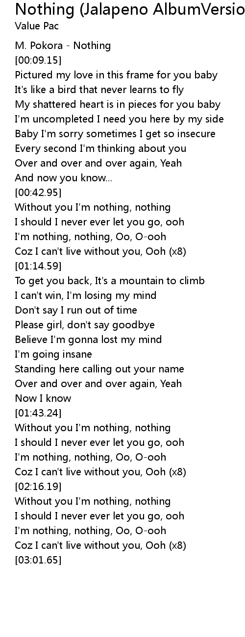 | [02:29.61] | Without you I'm nothing, nothing |