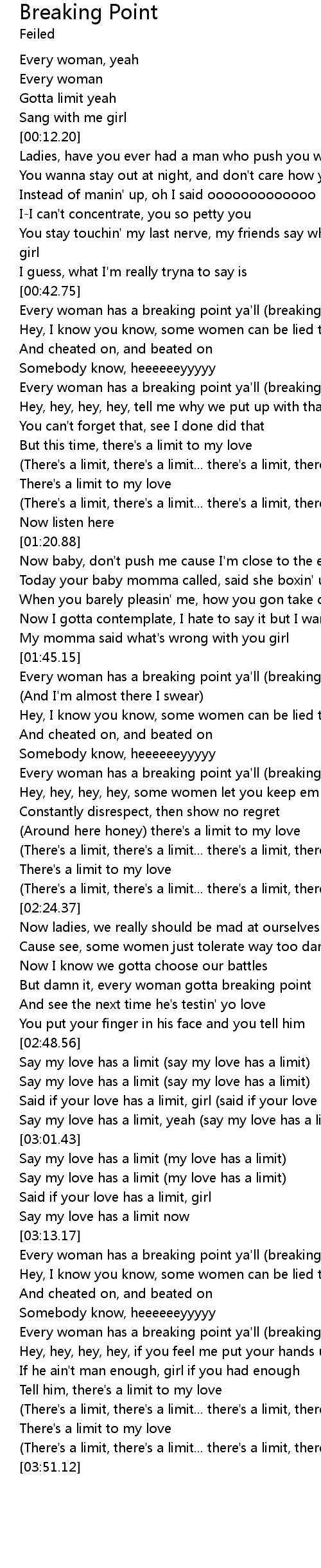 | [03:26.42] | Every woman has a breaking point ya'll (breaking point) |