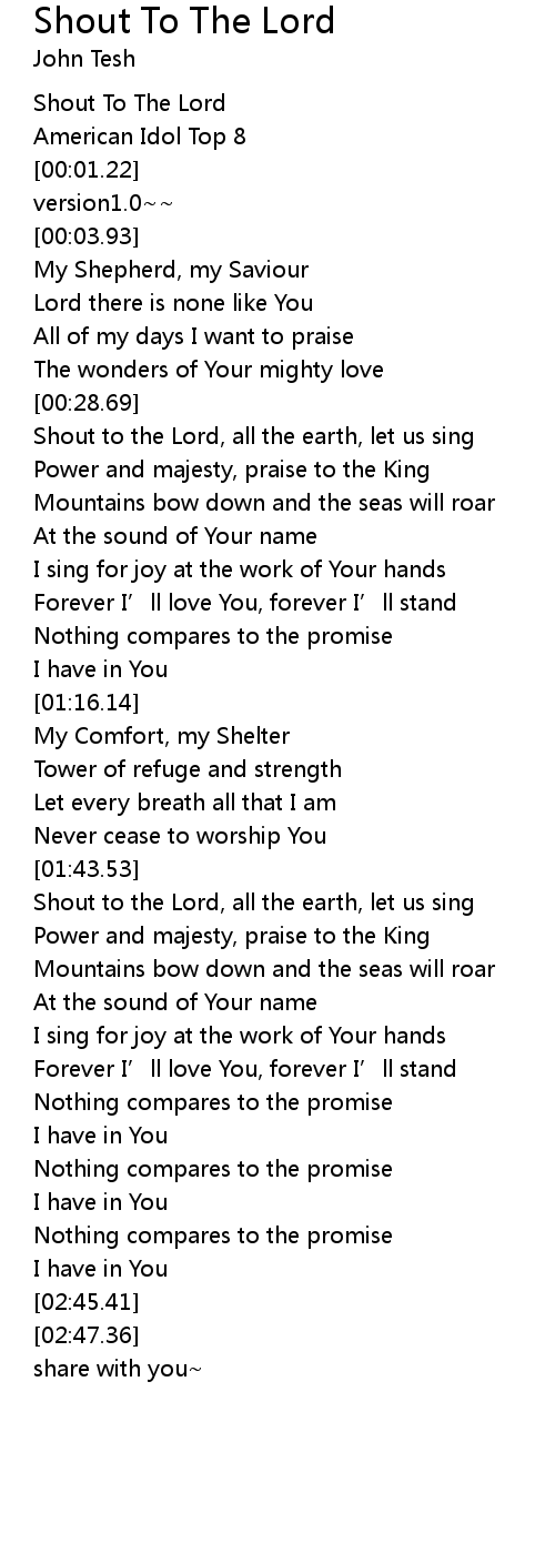 | [01:46.38] | Shout to the Lord, all the earth, let us sing |