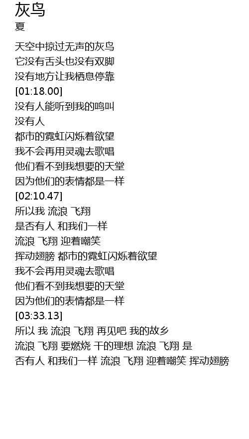 | [00:55.30] | 天空中掠过无声的灰鸟 |