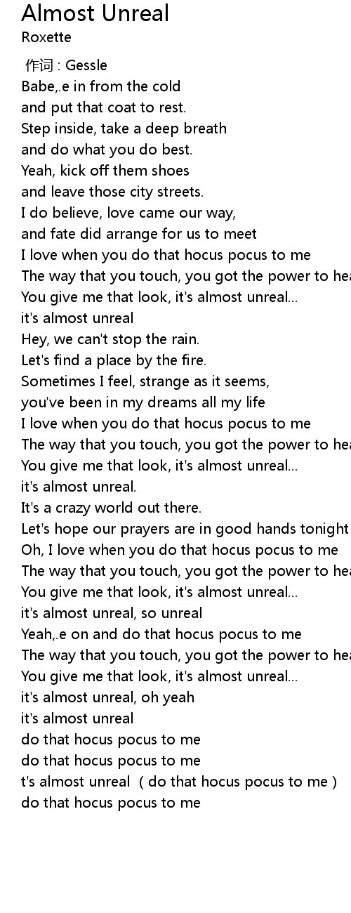 | [03:35.99] | t's almost unreal (do that hocus pocus to me) |
