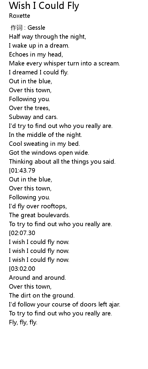 | [04:08.68][01:43.79] | I wish I could fly. |