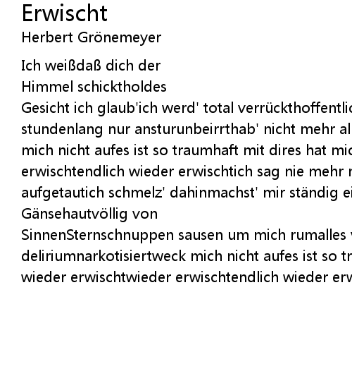 | SinnenSternschnuppen sausen um mich rumalles vibriertdu treibst mich ins deliriumnarkotisiertweck mich nicht aufes ist so traumhaft mit dires hat mich wieder erwischtwieder erwischtendlich wieder erwischt |