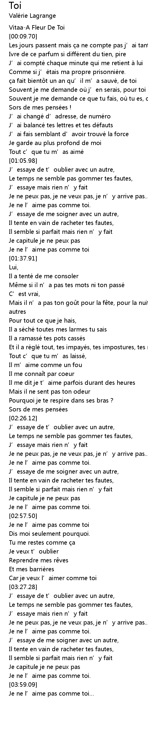 | [02:20.71] | Pourquoi je te respire dans ses bras ? |