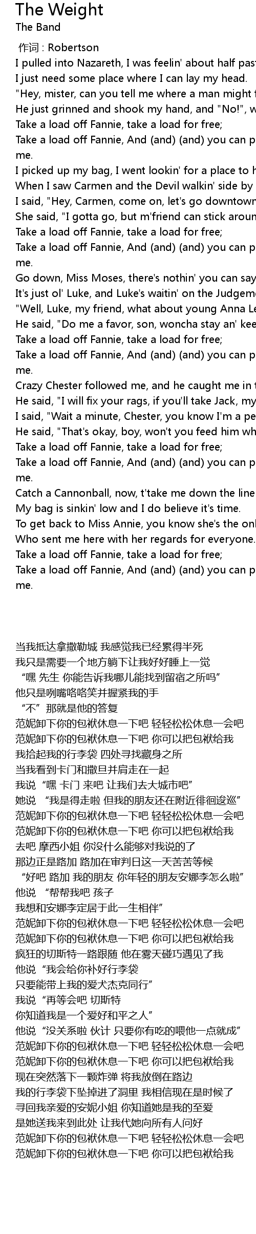 | [02:24.85] | Take a load off Fannie, And and and you can put the load right on me. |