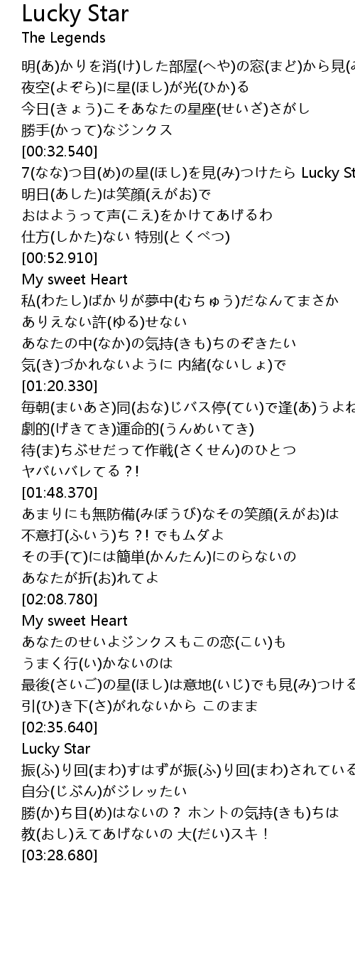 | [00:32.940] | 7(なな)つ目(め)の星(ほし)を見(み)つけたら Lucky Star |