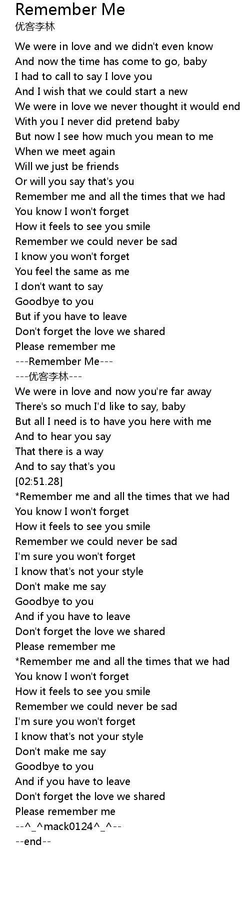| [02:04.50] | Remember Me |