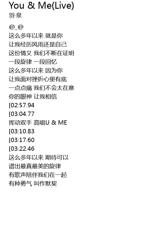 | [03:24.17][02:57.94][01:33.27] | 跟着我 挥动双手 高唱U & ME |