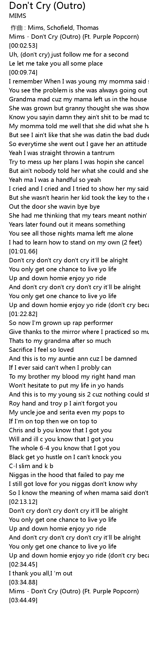 | [00:01.75] | Mims Don' t Cry Outro Ft. Purple Popcorn |