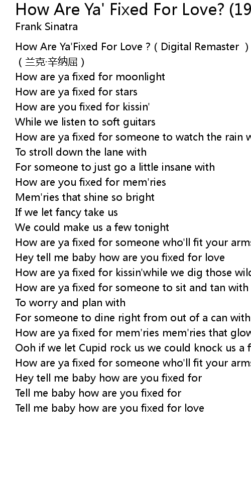 | [00:00.00] | How Are Ya' Fixed For Love ? Digital Remaster Frank Sinatra lan ke xin na qu |