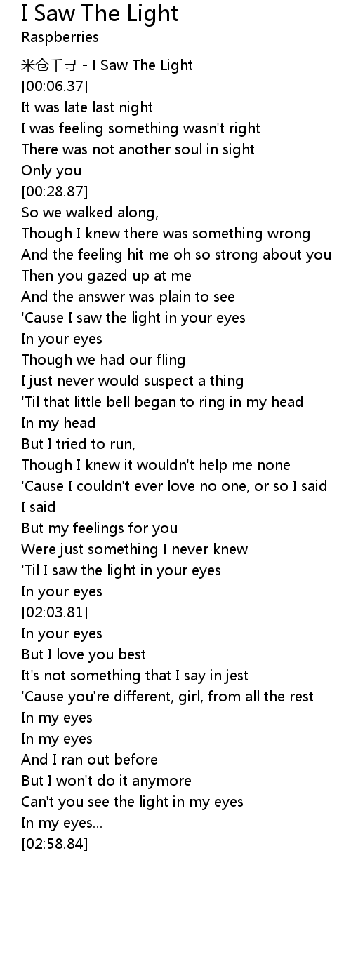 | [01:49.81] | ' Til I saw the light in your eyes |