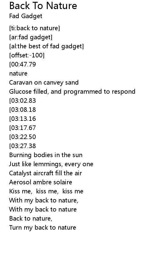[00:38.30][00:47.79][02:16.36][02:25.95][02:35.09][02:44.86][04:16.06] Back to nature