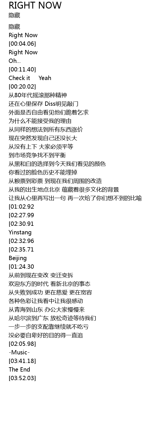 | [02:46.22][02:35.71][02:24.92][02:14.42][01:21.76][01:11.38] | Right Now Right Now Beijing |