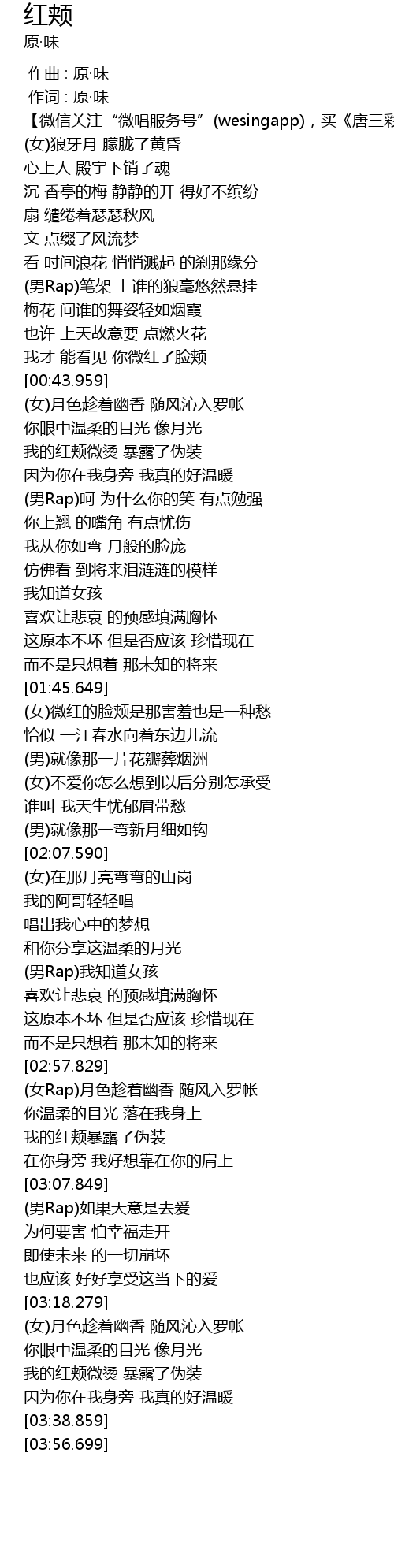 | [01:45.848] | nǚ wēi hóng de liǎn jiá shì nà hài xiū yě shì yī zhǒng chóu |