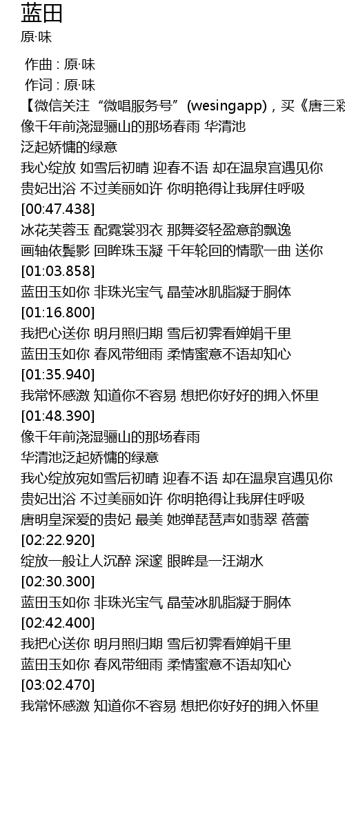 | [02:54.400] | 蓝田玉如你 春风带细雨 柔情蜜意不语却知心 |