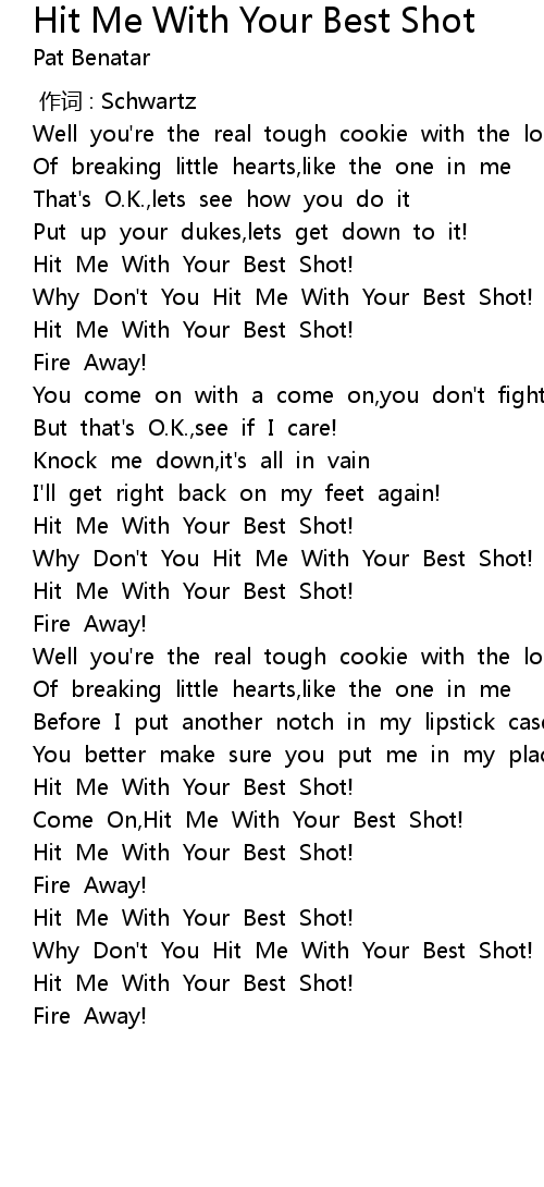 | [02:03.879] | Come On, Hit Me With Your Best Shot! |