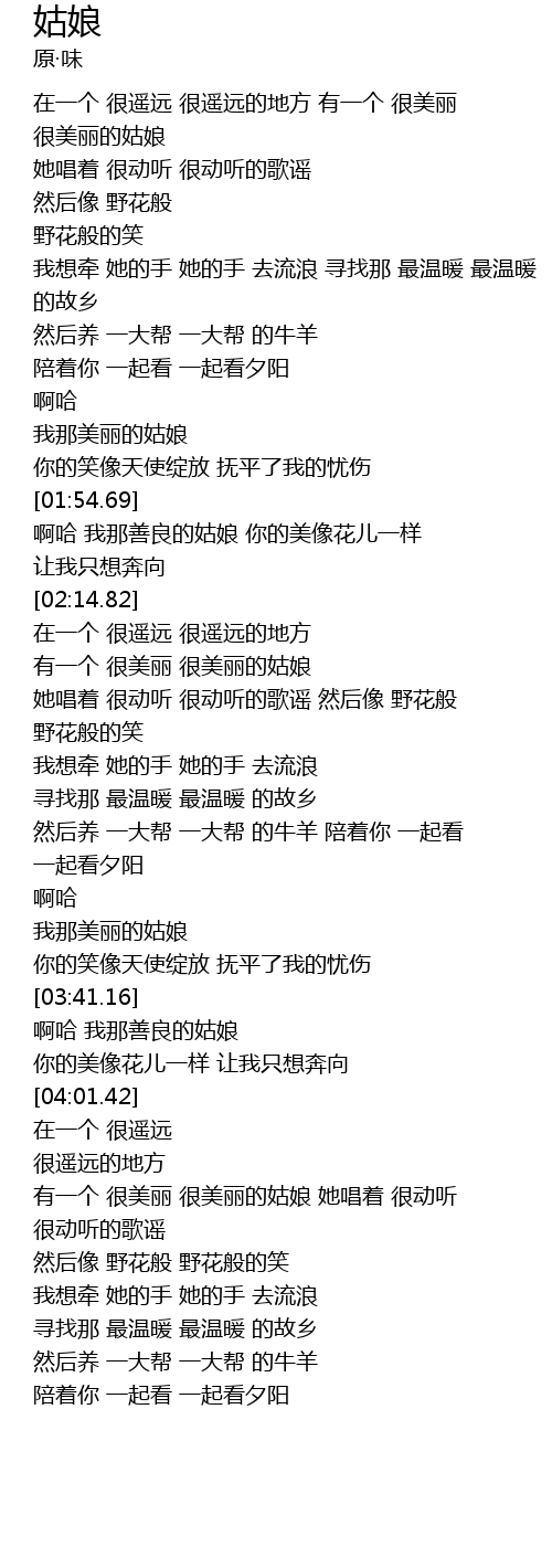 | [03:25.04] | wǒ nà měi lì de gū niáng |