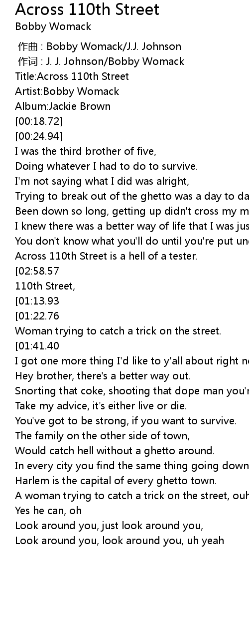 | [03:07.02][02:58.57][02:48.39][02:39.07][01:36.75][01:27.94][01:17.98][01:10.23] | Across 110th Street, |