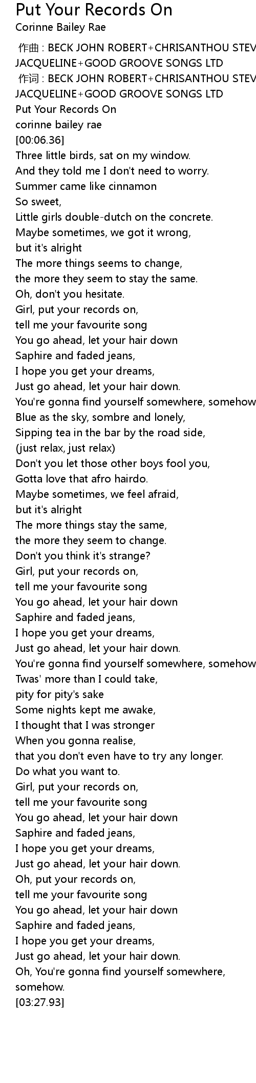 | [00:00.689] | 作词 : BECK JOHN ROBERT+CHRISANTHOU STEVEN+BAILEY RAE CORINNE JACQUELINE+GOOD GROOVE SONGS LTD |