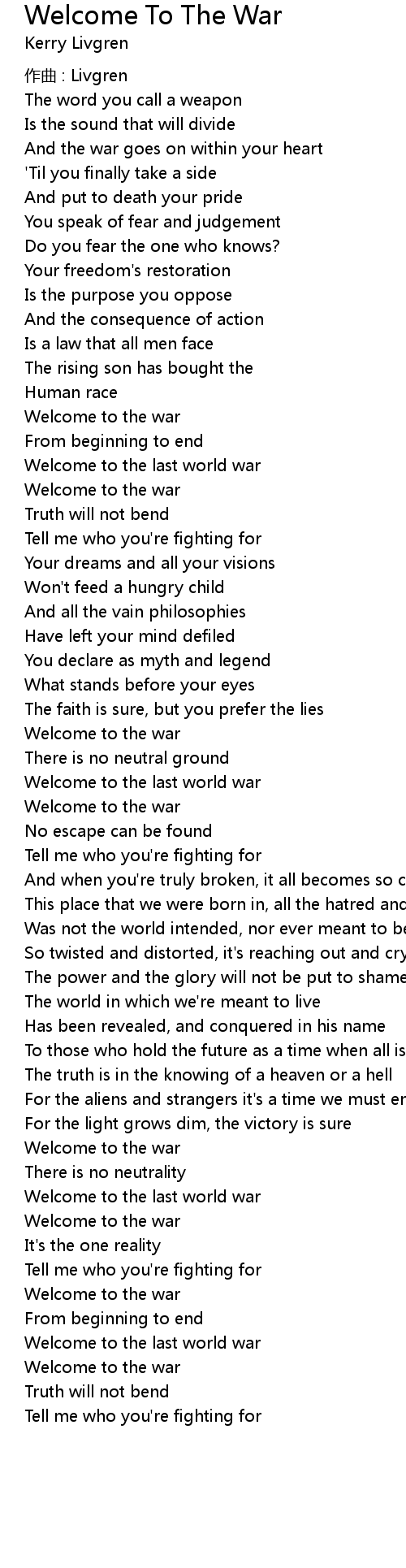 | Song | Welcome To The War |
