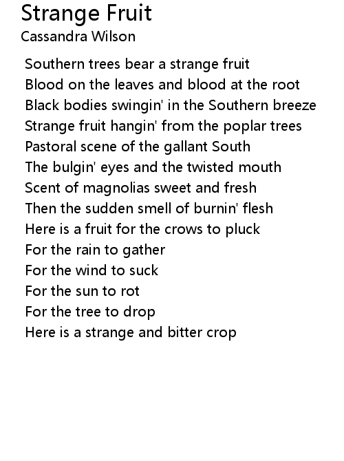 | Strange fruit hangin' from the poplar trees | |