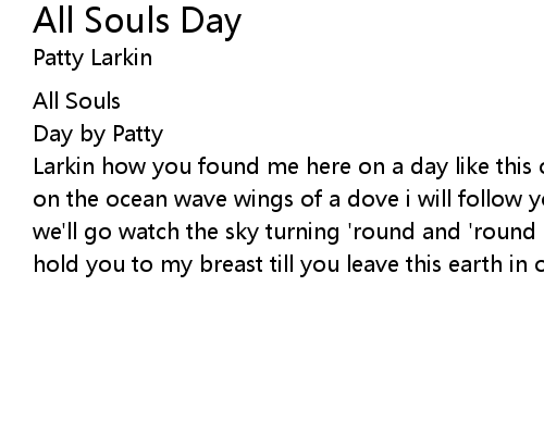 | Larkin how you found me here on a day like this one eye open dear one last kiss on the ocean wave wings of a dove i will follow you my love take a walk with me we'll go watch the sky turning 'round and 'round passing by and i hold you close hold you to my breast till you leave this earth in one last breath |