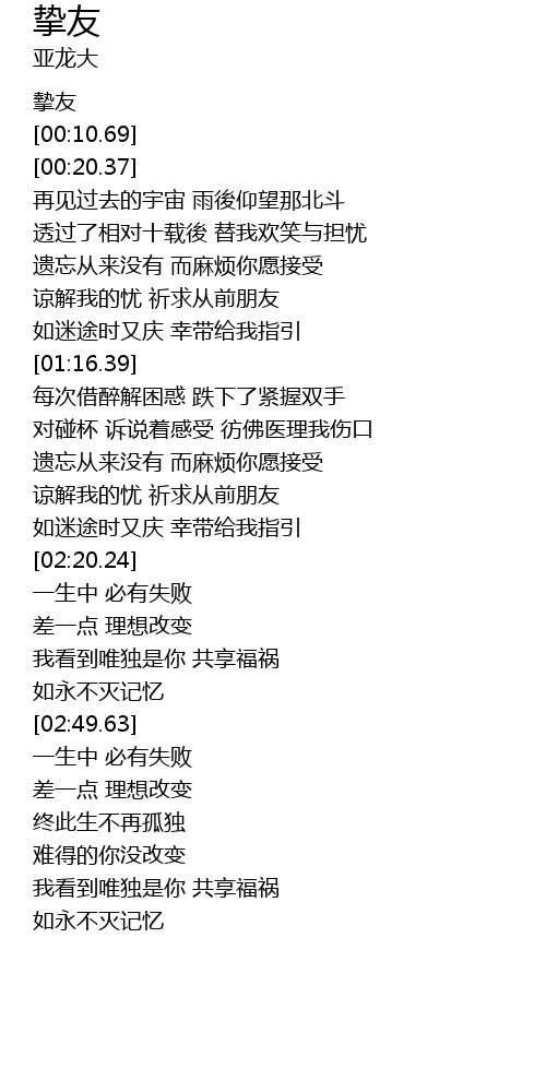 | [02:02.81] | 谅解我的忧 祈求从前朋友 |