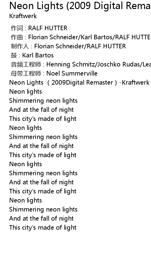 | [00:00.00] | Neon Lights 2009Digital Remaster Kraftwerk |