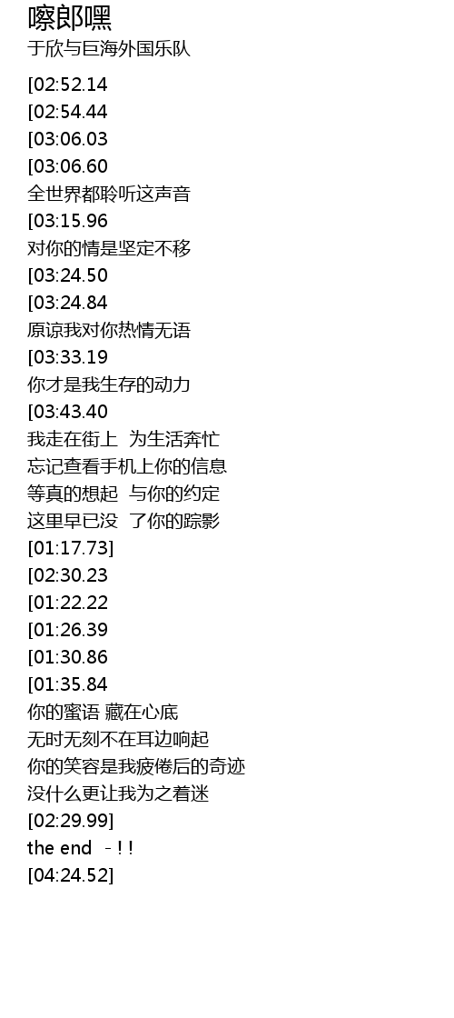| [04:01.58][03:24.84][01:54.39][00:24.77] | 嚓郎嘿 嚓郎嘿 原谅我对你热情无语 |