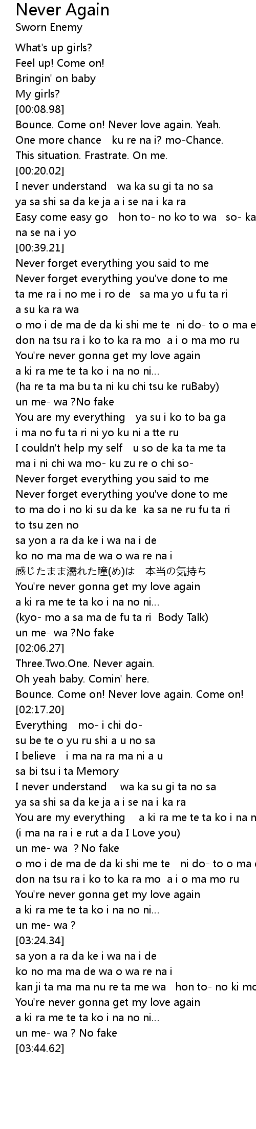 | [02:15.20] | Bounce. Come on! Never love again. Come on! |