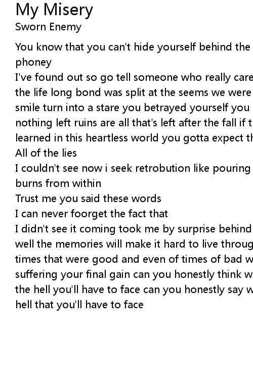 I didn't see it coming took me by surprise behind your facade you hid your shame well the memories will make it hard to live through all of this shame from the times that were good and even of times of bad we've through it all now im suffering your final gain can you honestly think what you've done makes it worh the hell you'll have to face can you honestly say what you've done makes the hell that you'll have to face |