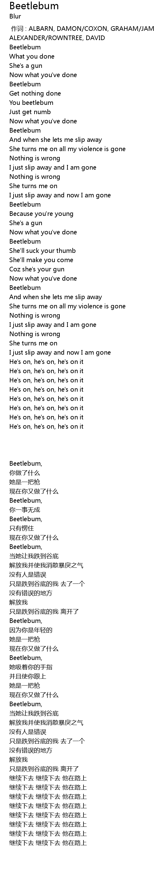 | [00:00.00] | 作词 : ALBARN, DAMON/COXON, GRAHAM/JAMES, STEVEN ALEXANDER/ROWNTREE, DAVID |
