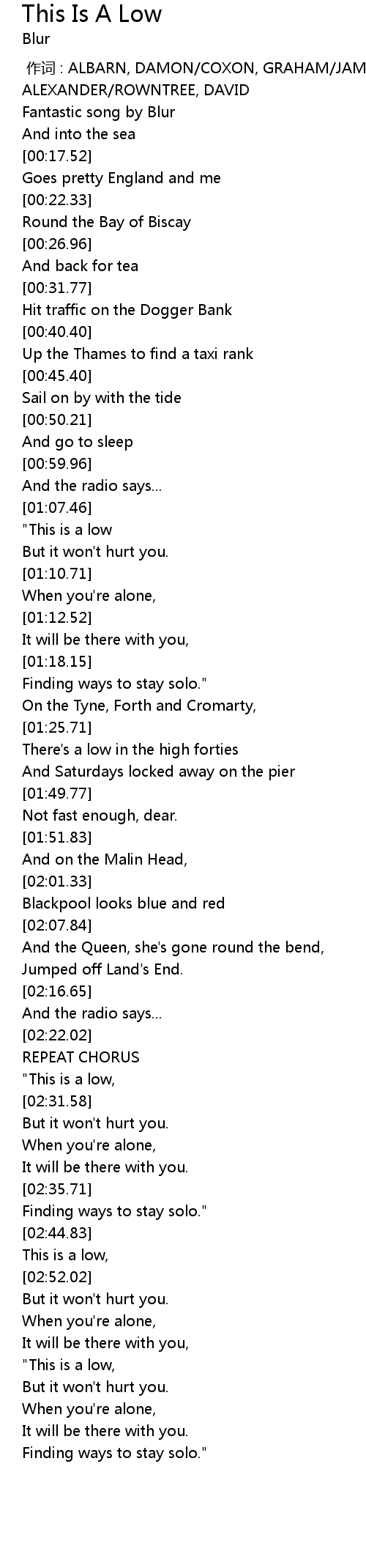| [00:00.00] | 作词 : ALBARN, DAMON/COXON, GRAHAM/JAMES, STEVEN ALEXANDER/ROWNTREE, DAVID |
