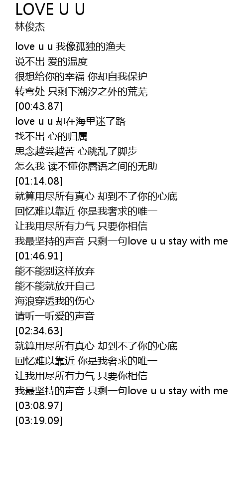 | [02:57.65] | wǒ zuì jiān chí de shēng yīn zhǐ shèng yī jù love u u stay with me |