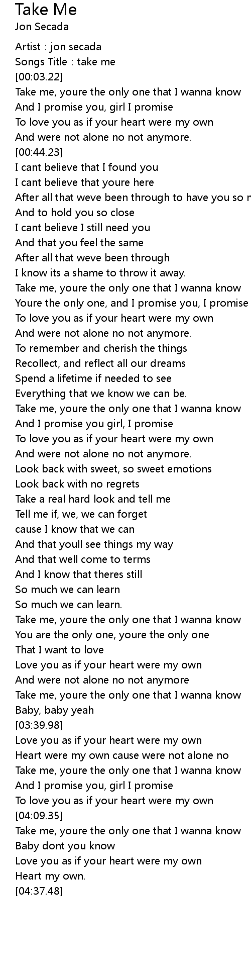 | [04:12.63] | Take me, youre the only one that I wanna know |