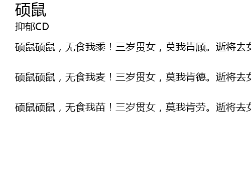 | 硕鼠硕鼠,无食我苗!三岁贯女,莫我肯劳。逝将去女,适彼乐郊。乐郊乐郊,谁之永号? |