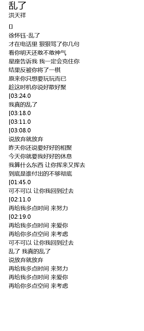 | [03:33.0][03:24.0][03:14.0][02:05.0][01:55.0][01:14.0][01:05.0] | 乱了 我真的乱了 |