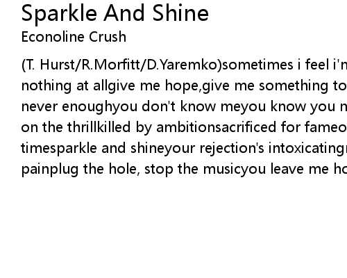 | (T. Hurst/R.Morfitt/D.Yaremko)sometimes i feel i'm going underyou don't feel nothing at allgive me hope,give me something to believe inthis jaded heart was never enoughyou don't know meyou know you never willcan't see inside melost out on the thrillkilled by ambitionsacrificed for fameone more time, one last timesparkle and shineyour rejection's intoxicatingmy high is incompletekill the painplug the hole, stop the musicyou leave me hollowwanting moredon't look back |