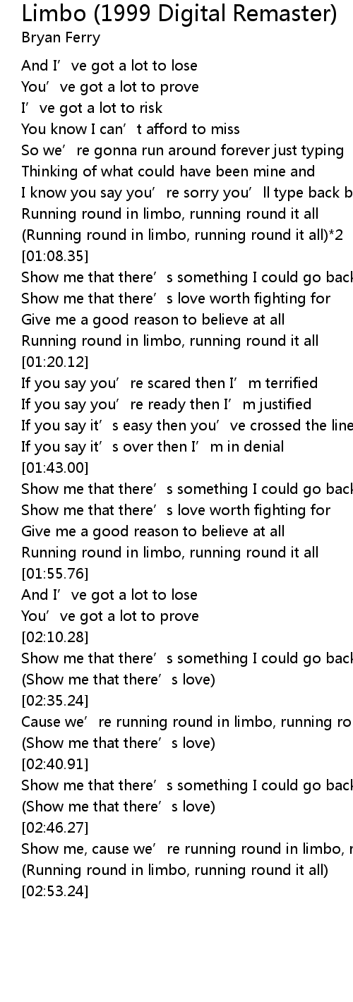 | [02:46.67] | Show me, cause we' re running round in limbo, running round it all |