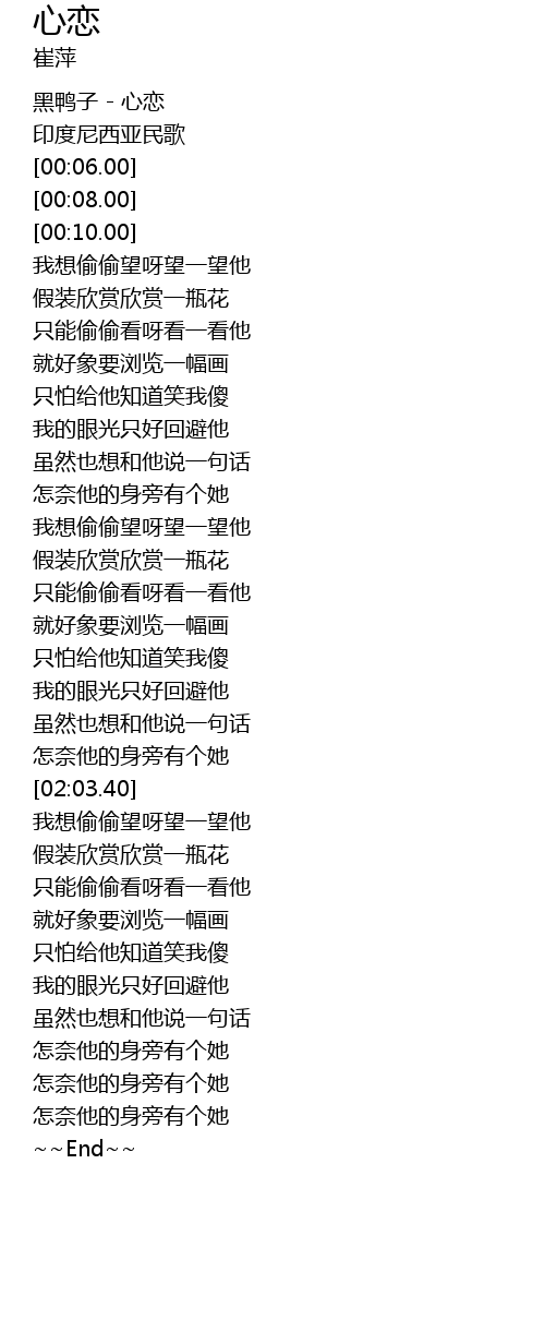 | [00:02.00] | 黑鸭子 - 心恋 |