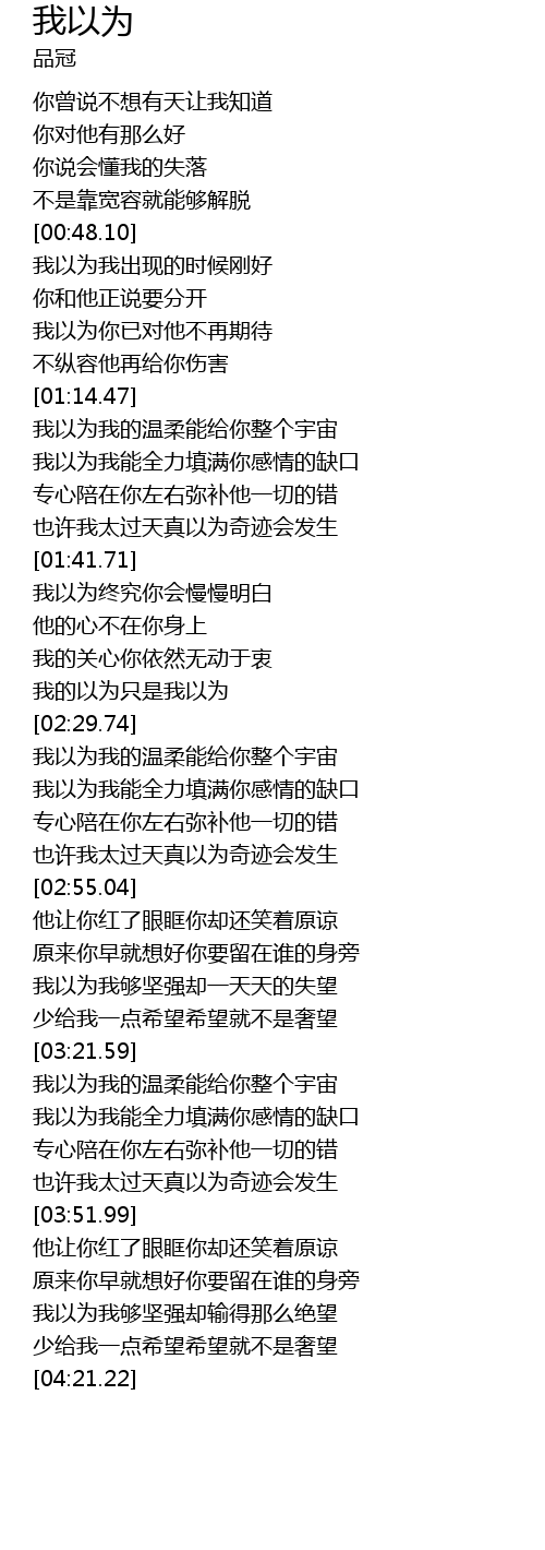 | [02:22.38] | wǒ de yǐ wéi zhǐ shì wǒ yǐ wéi |
