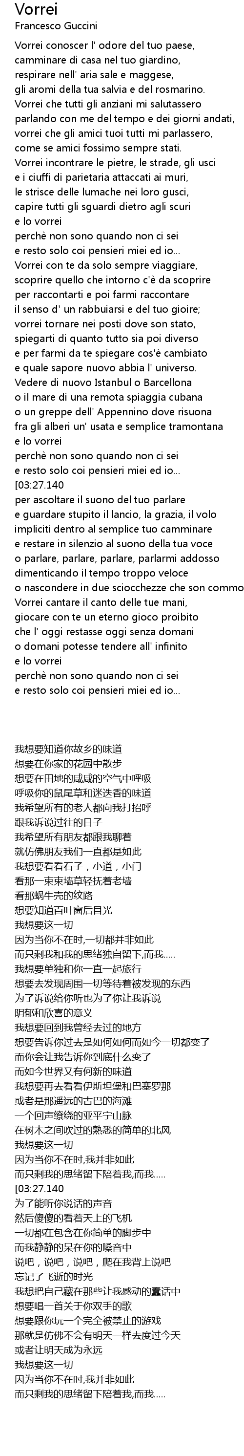 | [00:19.880] | Vorrei conoscer l' odore del tuo paese, |