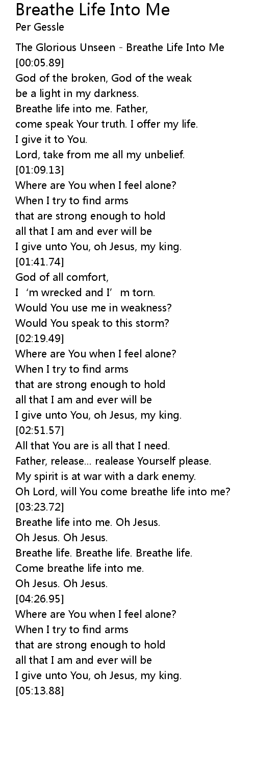 | [00:01.12] | The Glorious Unseen Breathe Life Into Me |
