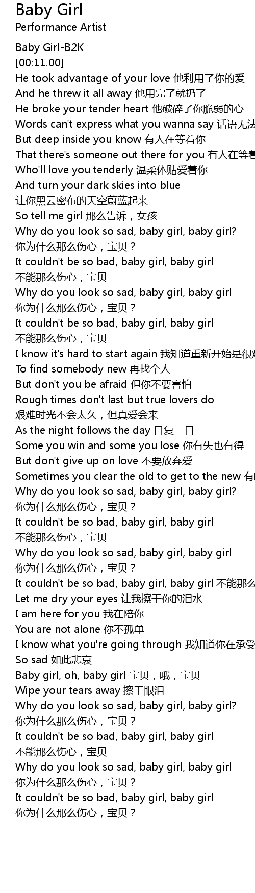 | [03:44.82] | Why do you look so sad, baby girl, baby girl nǐ wèi shí me nà me shāng xīn, bǎo bèi? |