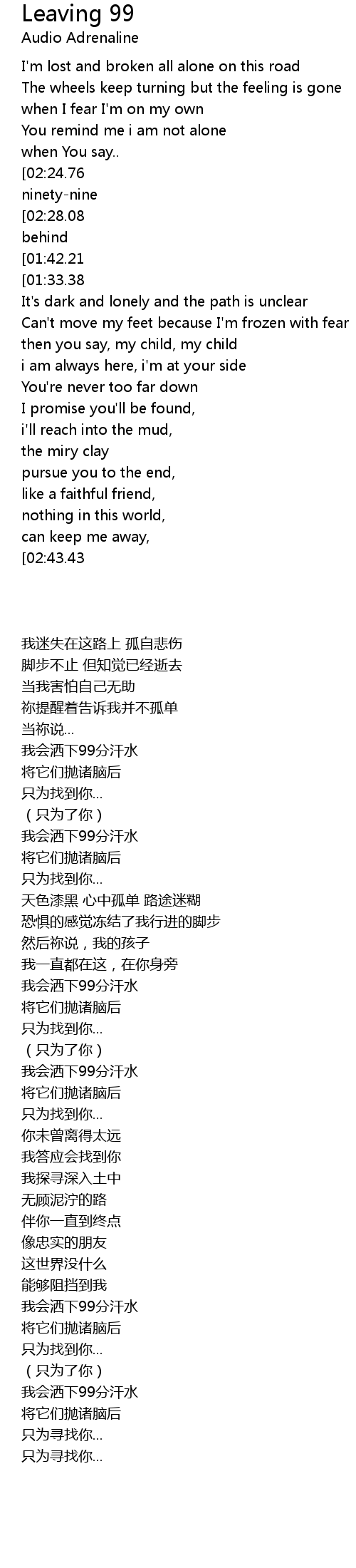 | [02:37.60][02:24.76][01:35.71][01:22.36][00:46.48][00:34.97] | I'd leave ninety-nine |